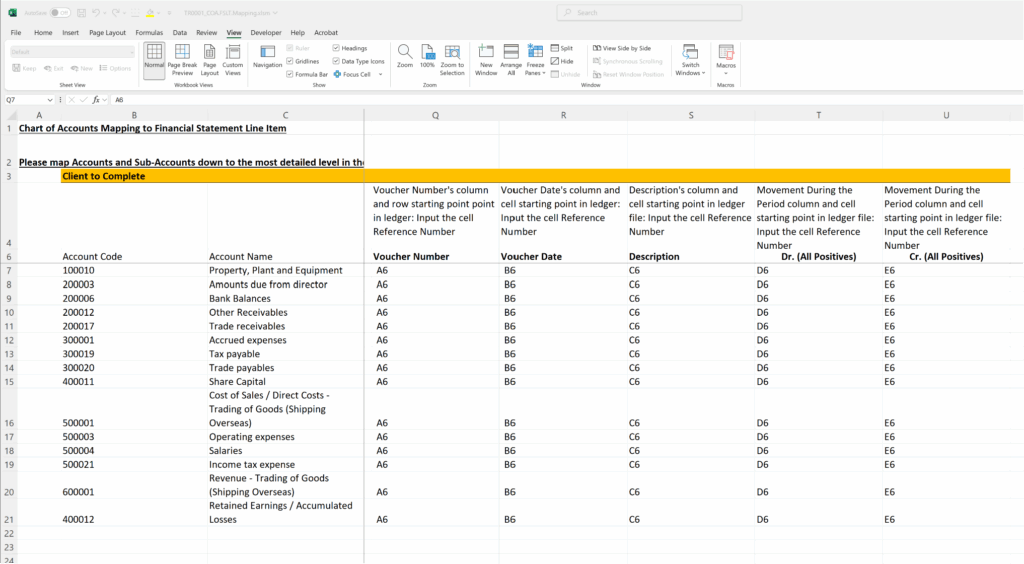 Based on the identified cell references from any sample ledger excel file, you may safely assume that all ledger excel files will have the same presentation format of data. The user may then copy and paste these cell references in each row in the COA Mapping Form, between columns Q to U. The screenshot below shows the completed cell references for this sample ledger file.